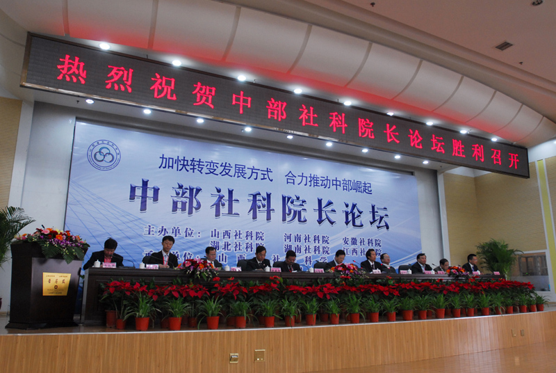 中部社科院长论坛旨在搭建中部六省社科研究合作的有效平台,形成中部六省智库互动协作的长效机制,在推动中部崛起中进一步发挥好地方智库的独特作用。首届中部社科院长论坛主题为“加快转变发展方式,合力推动中部崛起”,由山西省社科院党组书记、院长李中元和我院院长喻新安主持。论坛上,我院院长喻新安作了题为《中部崛起五年回顾与展望》的主题演讲,系统回顾了中部崛起战略提出五年来的成就、经验和存在的制约因素,并分析了中部地区未来发展前景和趋势。此外,喻新安院长还应邀接受了山西电视台组织的中部六省社科院院长专题访谈。