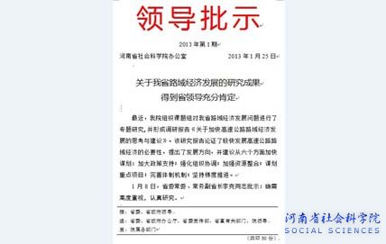 一、关于我省路域经济发展的研究成果得到省领导充分肯定 最近,我院组织课题组对我省路域经济发展问题进行了专题研究,并形成调研报告《关于加快高速公路路域经济发展的思考与建议》。该研究报告论证了较快发展高速公路路域经济的必要性,提出了发展方向,并建议从六个方面加快谋划:加大政策支持;强化组织协调;加强资源整合;谋划重点项目;完善体制机制;坚持梯度推进。 1月8日,省委常委、常务副省长李克同志批示:确需高度重视,认真研究。 二、我院调研课题《新型城镇化进程中实现河南省农村人口有序转移研究》获省领导肯定 根据省政府安排部署,我院组织课题组开展《新型城镇化进程中实现河南省农村人口有序转移研究》课题调研,并形成调研报告。该研究报告分析了新型城镇化进程中河南农村人口转移的现状、特点、存在问题及原因,以及实现人口有序转移的条件、思路和途径,并提出相关政策建议。 1月29日,副省长赵建才同志批示肯定并提出要求:研究报告已阅。感谢同志们付出的辛勤劳动,有很大裨益。新型城镇化的核心是农村转移人口的“市民化”,在城镇就业、落户。请你们做一个补充研究,对这种“市民化”的成本做一个解剖分析,结合河南省情,调查研究,成本有多大?构成因素哪些?如何建立成本的分担机制?等等。这样在实际工作便于订政策。谢谢! 三、我院关于“宜阳现象”和“宜阳经验”的调研报告获省领导肯定 近期,我院组织专家到传统农业县、国家级贫困县——宜阳调研,对其后发赶超的做法进行分析总结,概括了“宜阳现象”和“宜阳经验”,并形成调研报告。 2月28日,副省长王铁同志对《领导参阅》2013年第16期刊发的《县域经济发展的一面旗帜》和《呈阅件》2013年第1 期刊发的《宜阳县后发赶超的调查与思考》作出批示:宜阳的发展变化值得很好的研究,很好的学习和借鉴。